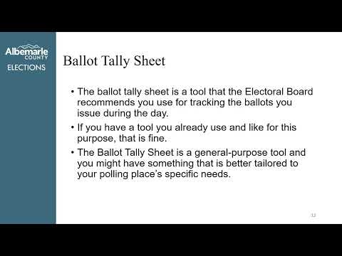 The Albemarle County Department of Elections ran a training for ballot officers covering how to count and document ballot packs, manage spoiled and provisional ballots in envelope 4, use the ballot tally sheet and ballot record report, and use ExpressVote as an emergency option. The session emphasized careful counting, documentation and secure sealing of voted and unvoted ballot boxes.