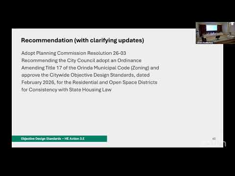 The Orinda Planning Commission voted unanimously to recommend that the City Council adopt citywide objective design standards (ODS) and an ordinance amending Title 17, with staff-directed clarifying edits and an added introductory 'how‑to' describing the ministerial streamlining path under state housing law.