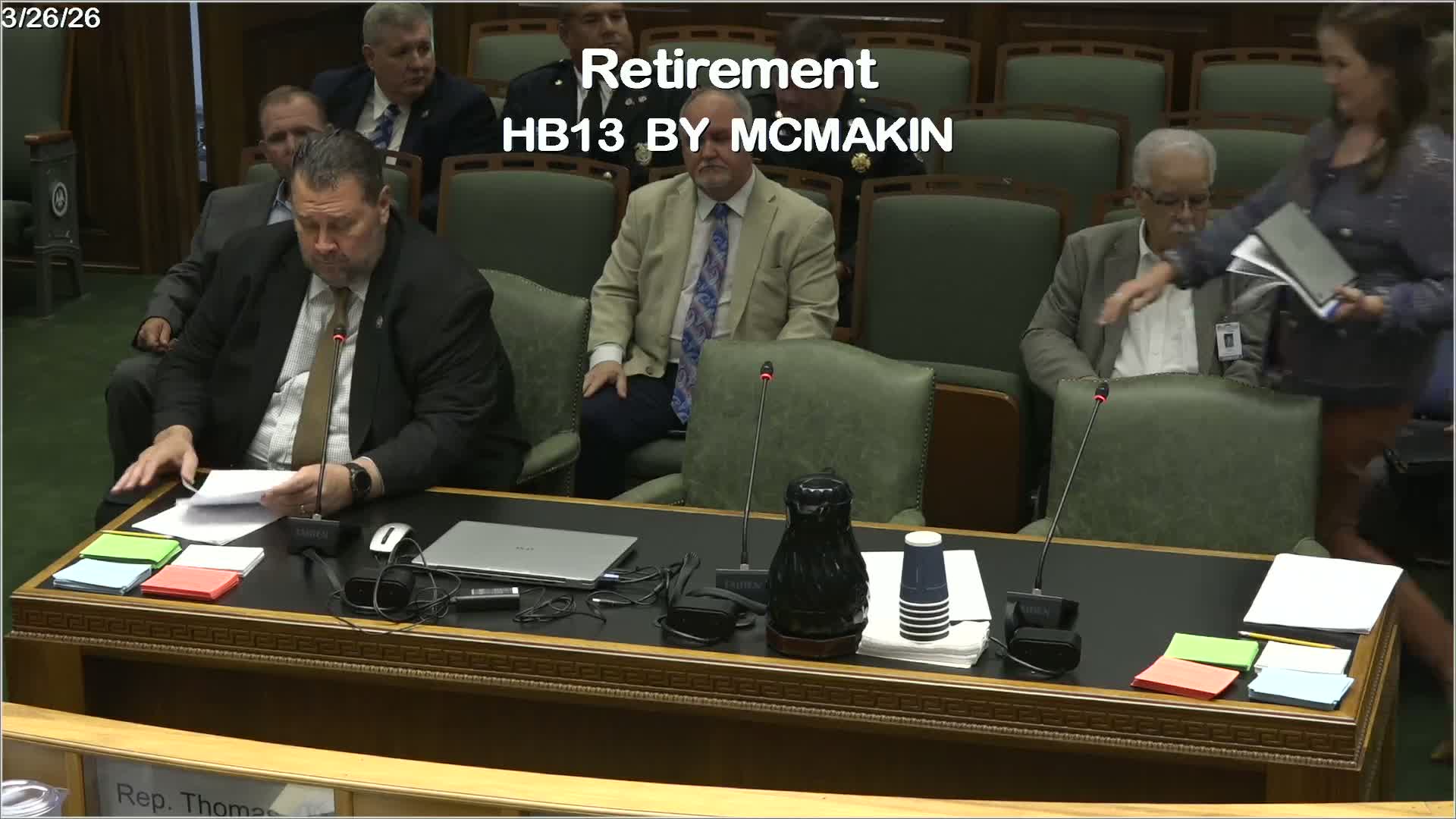 The committee adopted amendments and reported HB 13, a bill that consolidates past debts/credits in the State Police Retirement System into a single 20-year amortization and sets a 15-year basis for future changes to reduce volatility in employer contribution rates.