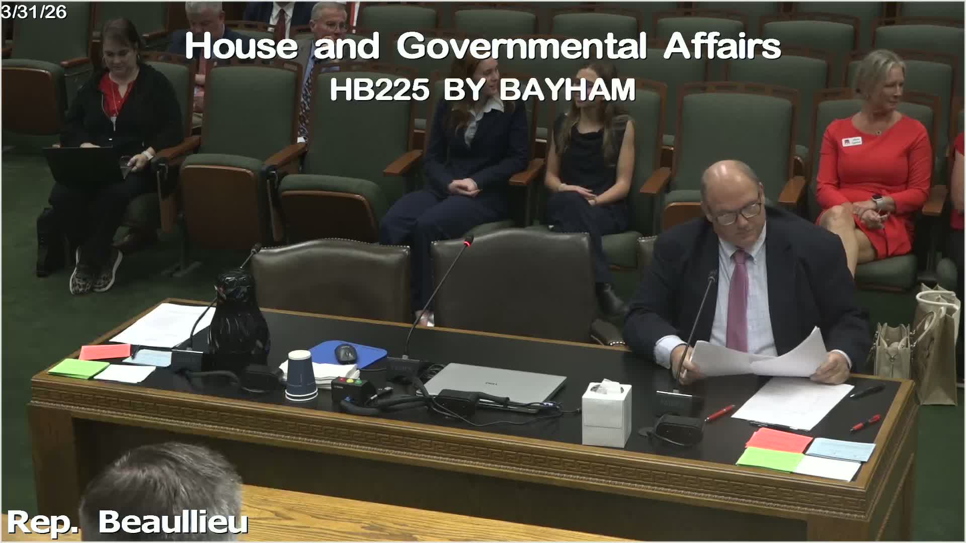After public comment in support from Bruce Riley and further committee discussion, the clerk called a roll: the committee recorded 11 yeas and 2 nays (Representative Boyd and Representative Newell cast the two no votes). The committee reported House Bill 225 favorable to the next stage.
