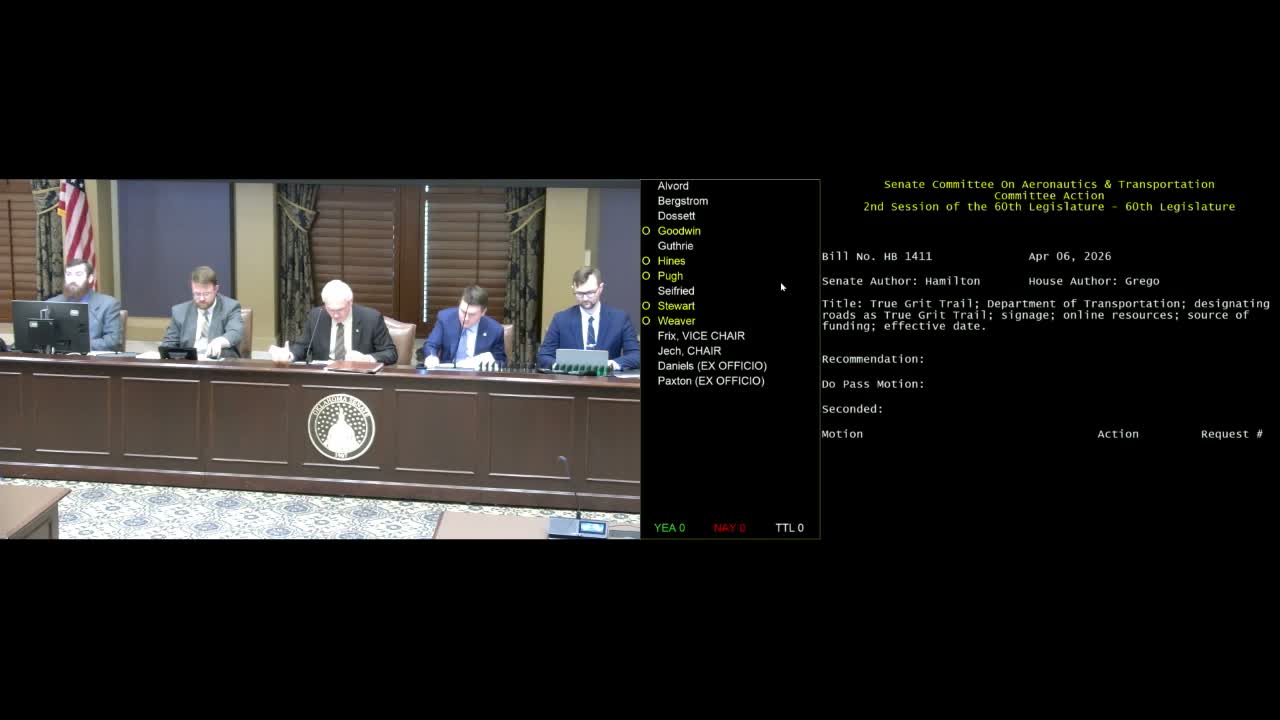- House Bill 1411: Establish the "True Grit Trail" to promote tourism in southeast Oklahoma. Sponsor said the bill carries a $0 fiscal impact; committee vote 7-0 to advance.