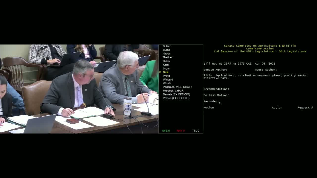 The committee adopted an amendment to HB 2,975 and approved the bill to require nutrient‑management plan amendments to cover poultry waste removed off‑site and land‑applied for the next six years; Department of Agriculture staff said the change was requested to simplify reporting for operators who both land‑apply and export litter.