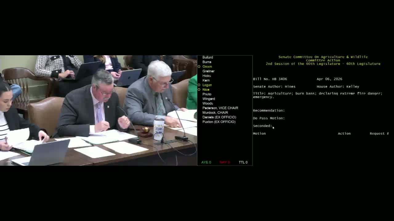 The Agriculture Committee approved two bills altering how burn bans and prescribed-burn programs are managed: HB 3,406 eases the trigger for burn bans and shortens delegated resolution periods; HB 34‑04 makes technical adjustments to the state's prescribed‑burn program after several years of implementation.