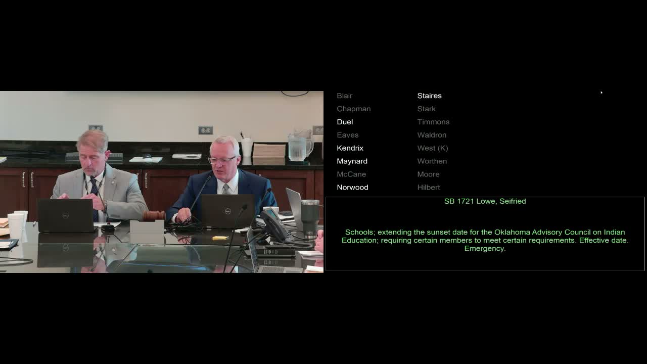 Representative Lowe presented Senate Bill 17‑21 to extend the sunset for the Oklahoma Advisory Council on Indian Education to July 1, 2029, and require appointees to represent tribes or tribal education; the committee adopted the bill and the clerk announced 10 ayes, 0 nays.