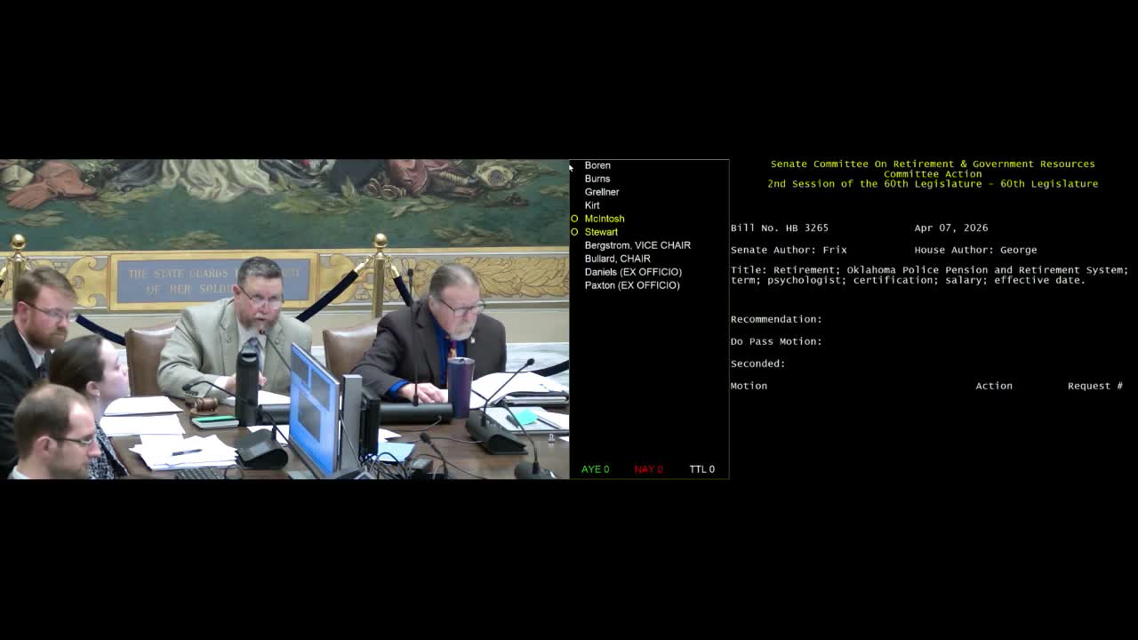 Senator Fricks described the bill as defining a "qualified mental health specialist" to include psychologists and additional licensed practitioners so a psychologist can make the final PTSD determination instead of requiring both a psychologist and a psychiatrist or medical doctor. Ginger Sigler, director of the Oklahoma Police Pension, told senators that the current process often requires paying for a psychologist assessment and then sending the matter to a psychiatrist or medical doctor for final determination, duplicating costs and creating delays because psychiatrists are in short supply.