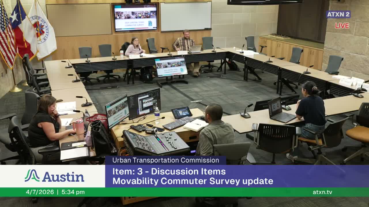 Moveability presented a 2025 regional commuter survey of 1,874 respondents showing a 71% drive-alone rate across six counties (68% in the three-county Travis/Hays/Williamson area), a drop in bike commuting and evidence that employer subsidies increase active/shared-mode use.