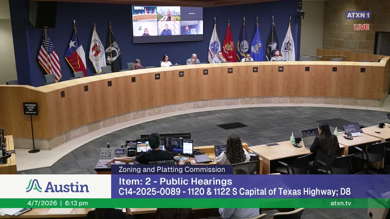 The Zoning and Planning Commission voted to approve a DB‑90 overlay allowing up to a roughly 70‑foot, mixed‑use redevelopment at 1120–1122 South Capital of Texas Highway after heated debate; neighbors pressed for traffic, evacuation and watershed analyses and conditional protections that commissioners discussed but did not make prerequisites to approval.