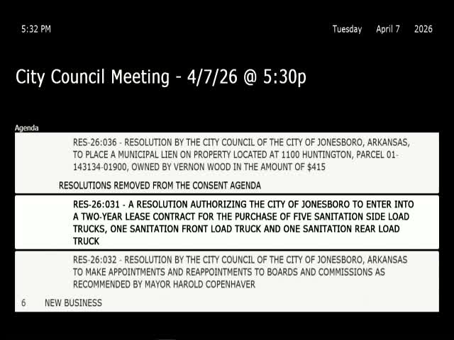The Jonesboro City Council voted to authorize a two‑year lease to finance seven sanitation vehicles, city staff said Thursday.