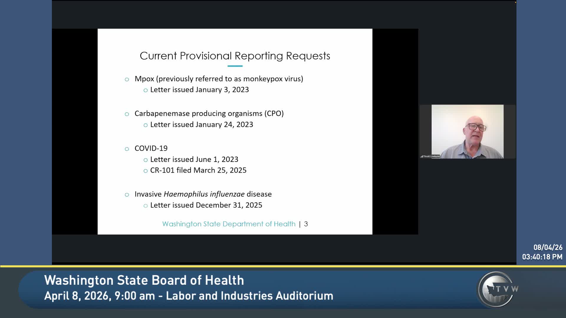 State epidemiologist Scott Lindquist explained the provisional reporting safety valve that allows the state health officer to require time‑limited reporting before permanent rulemaking: laboratory reporting of mpox and expanded species reporting for carbapenemase‑producing organisms has already helped detect outbreaks and inform public‑health intervention.