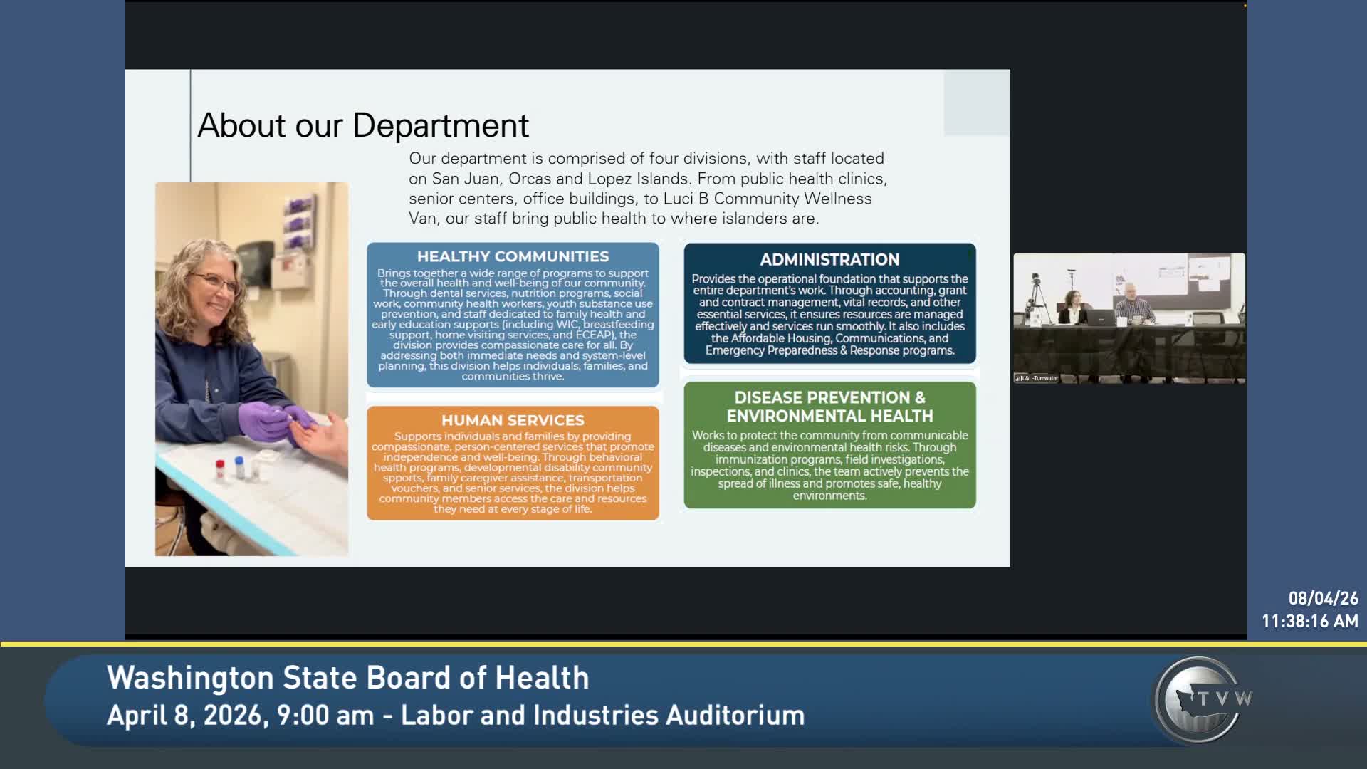 San Juan County officials told the State Board of Health about a regional dental‑van program, housing trust funding, and a mobile ‘‘wellness van’’ that together expanded access in a small island county that doubles population seasonally.