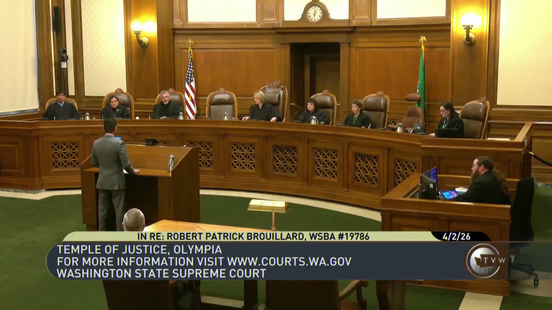The Washington State Supreme Court heard arguments April 2 on whether to suspend attorney Robert Brouillard for repeatedly failing to provide records in three grievances alleging trust-account violations. ODC asked for an interim suspension under ELC 7.283; Brouillard cited personal hardship and pledged to produce documents by the end of April. The matter was submitted with no ruling.