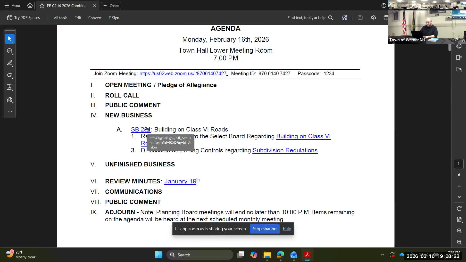 At a Feb. 16 work session the Town of Warner Planning Board discussed RSA 674:41 I(c), concerns about insurance and emergency access for homes on Class VI roads, and agreed to draft a letter recommending selectboard policy updates and subdivision‑regulation changes before the statute takes effect July 1, 2026.