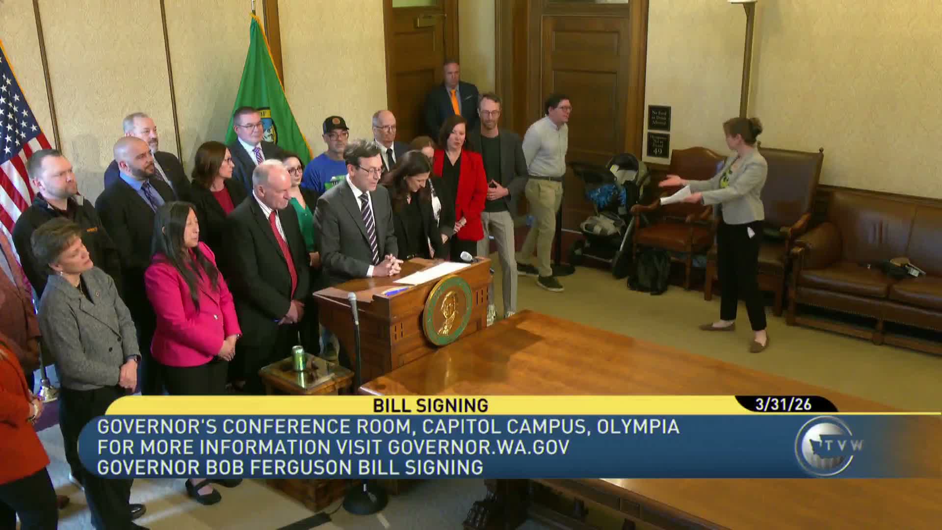 The signing included thanks to legislative leaders (the official named State Senator Marco Lias, Senator Curtis King, Representative Jake Fye and Andrew Barkas) and a photo opportunity. State Representative Jake Fye also spoke, thanking the governor and staff and noting the need for continued work on ferries and maintenance.
