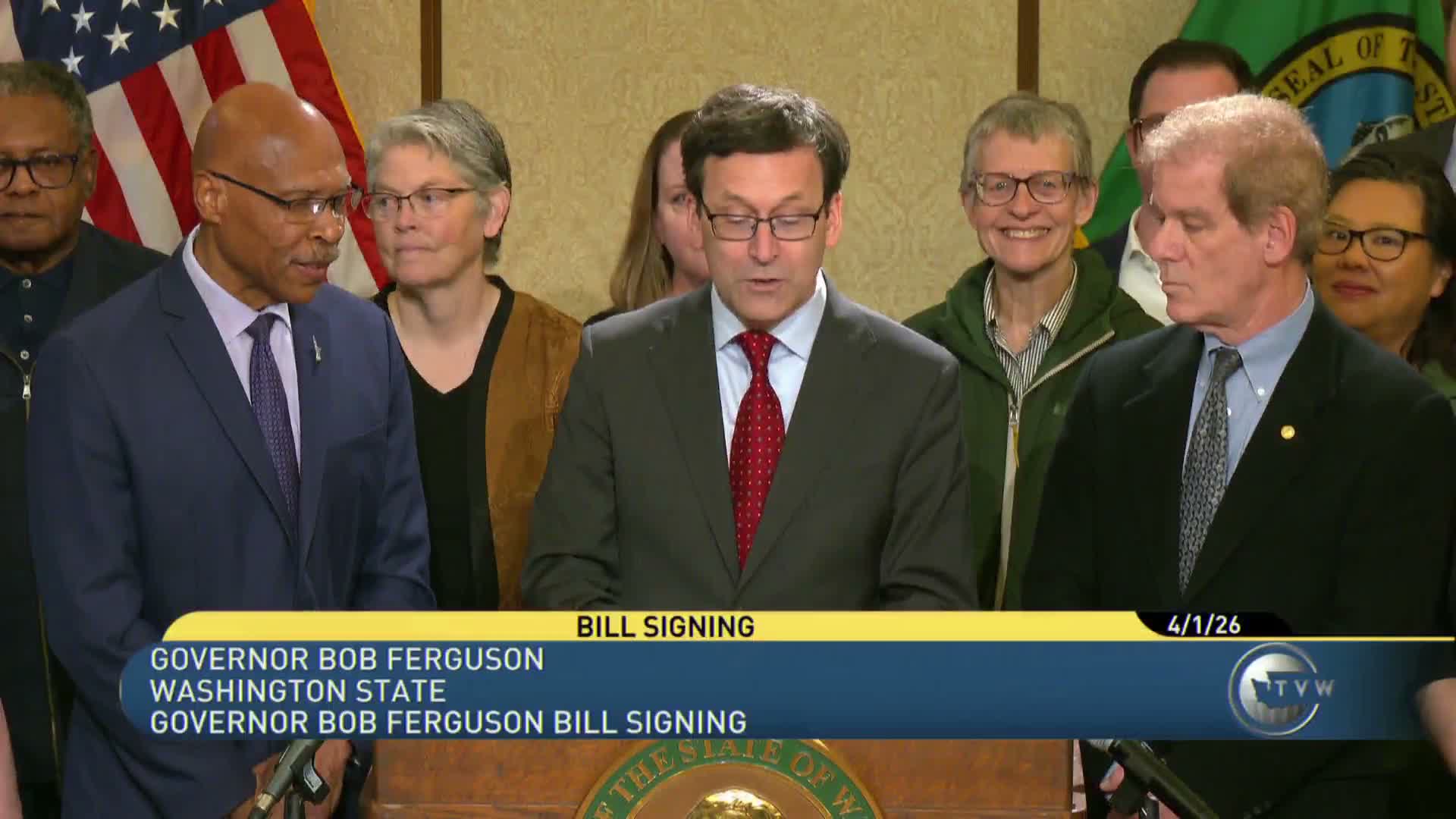 Highlights from the ceremony: the Presenter said Senate Bill 5974 "modernizes Washington law governing sheriffs, police chiefs, and town marshals by setting these minimum qualifications" and noted they "do have some reservations about the process for creating a vacancy" and expect interim work on that point. House Bill 1960 was described as leveling clean energy tax payments over time and redistributing payments to local governments and tribal nations. House Bill 2034 terminates LEHI 1, establishes a new plan and transfers excess funds with protections to ensure benefits for vested members, and the new plan will not open until June 2029. House Bill 2681 raises cannabis license fees to keep licensing operations funded. House Bill 2487 closes a B&O tax loophole tied to an earlier Washington Supreme Court case so only businesses that paid the insurance premium tax may claim the exemption. Senate Bill 6228 adjusts B&O tax rates for large drug distributors while protecting critical access pharmacies. Senate Bill 6231 narrows exemptions for data center server replacements and is expected to raise more than $350,000,000 through 2031. Senate Bill 6260 included administrative changes to help balance the budget.