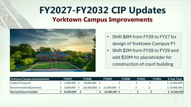 Susan (county staff) said the space‑study implementation project was renamed "Yorktown Campus Improvements" and described placeholder dollars moved in the CIP. "We originally had $12 million in here for this project," Susan said; she said staff had "accelerated some of that funding to '27'" and moved construction dollars to FY29 while adding $20 million as a placeholder for later phases. She emphasized the numbers are preliminary and will be refined during design and in the 15‑year CIP update.