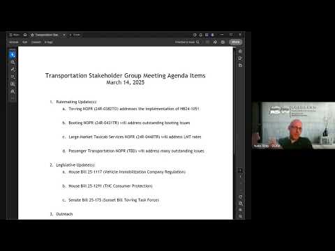 Nate Riley, section chief for transportation at the Public Utilities Commission, told stakeholders on March 14 that the commission’s towing rulemaking (24R0382) has cleared exception periods and that the attorney general’s opinion was filed earlier that week, setting the rules to become effective April 14, 2025.