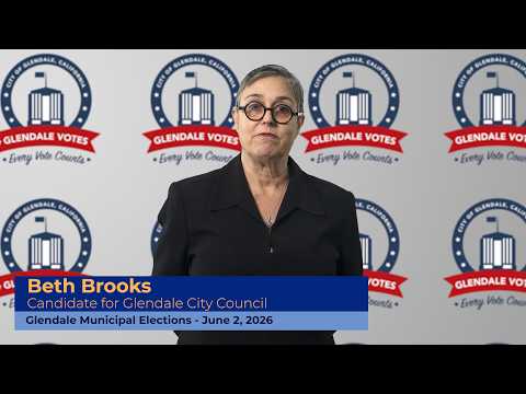 Beth Brooks, a 30-year Glendale resident, announced her campaign for Glendale City Council and outlined a platform prioritizing street safety, preserving single-family neighborhoods, protecting city parking, opposing major lane removals for bike lanes, and a one-year moratorium on discretionary spending. She asked for votes on June 2.