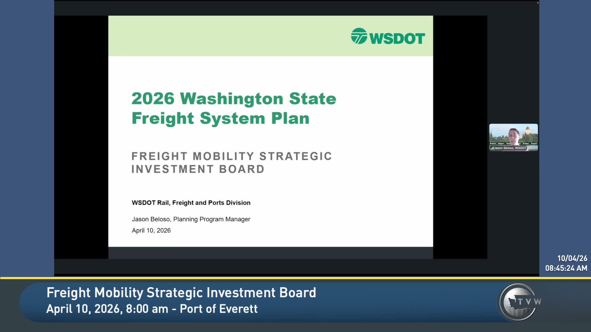 At the April 10 meeting the Washington Patriot Mobility strategic investment board heard a presentation on the 2026 State Freight Plan update and an amended Freight and Goods Transportation System (FGTS/FTTS) county data submission, and a staff motion to approve the amended FGTS/FTTS submission was carried.