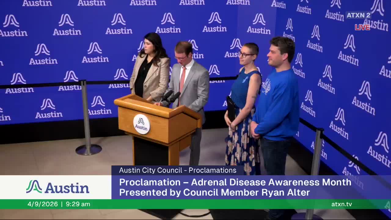 Alter read the proclamation, which detailed adrenal diseases including Addison's and Cushing's syndromes and announced that Austin City Hall would be lit in blue on April 25 to mark awareness activities. The proclamation pointed people to resources from the National Adrenal Diseases Foundation for further information.