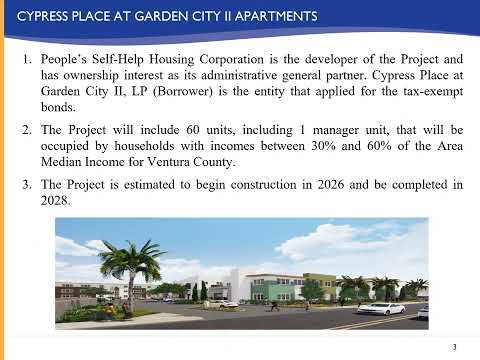 The presenter named People’s Self Help Housing Corporation as the project's developer and administrative general partner and identified Cypress Place at Garden City 2 LP as the borrower applying for the bonds. He said the development would include 60 units, including one manager unit, targeted to households with incomes between 30 and 60 percent of the area median income for Ventura County. Metchas estimated construction would begin in 2026 with completion in 2028.