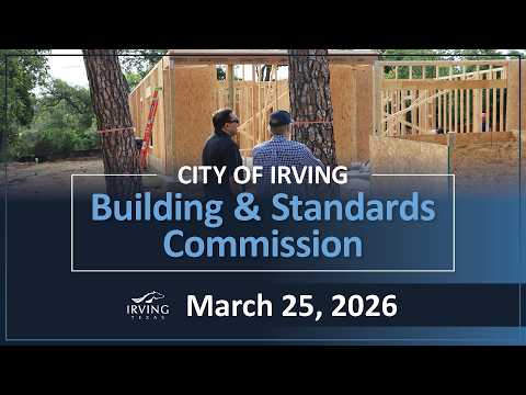 The City of Irving Building and Standards Commission on March 25, 2026, heard eight continued code-enforcement cases and accepted staff recommendations for each item, directing owners to complete repairs or appear at future hearings and authorizing city action if deadlines are missed.