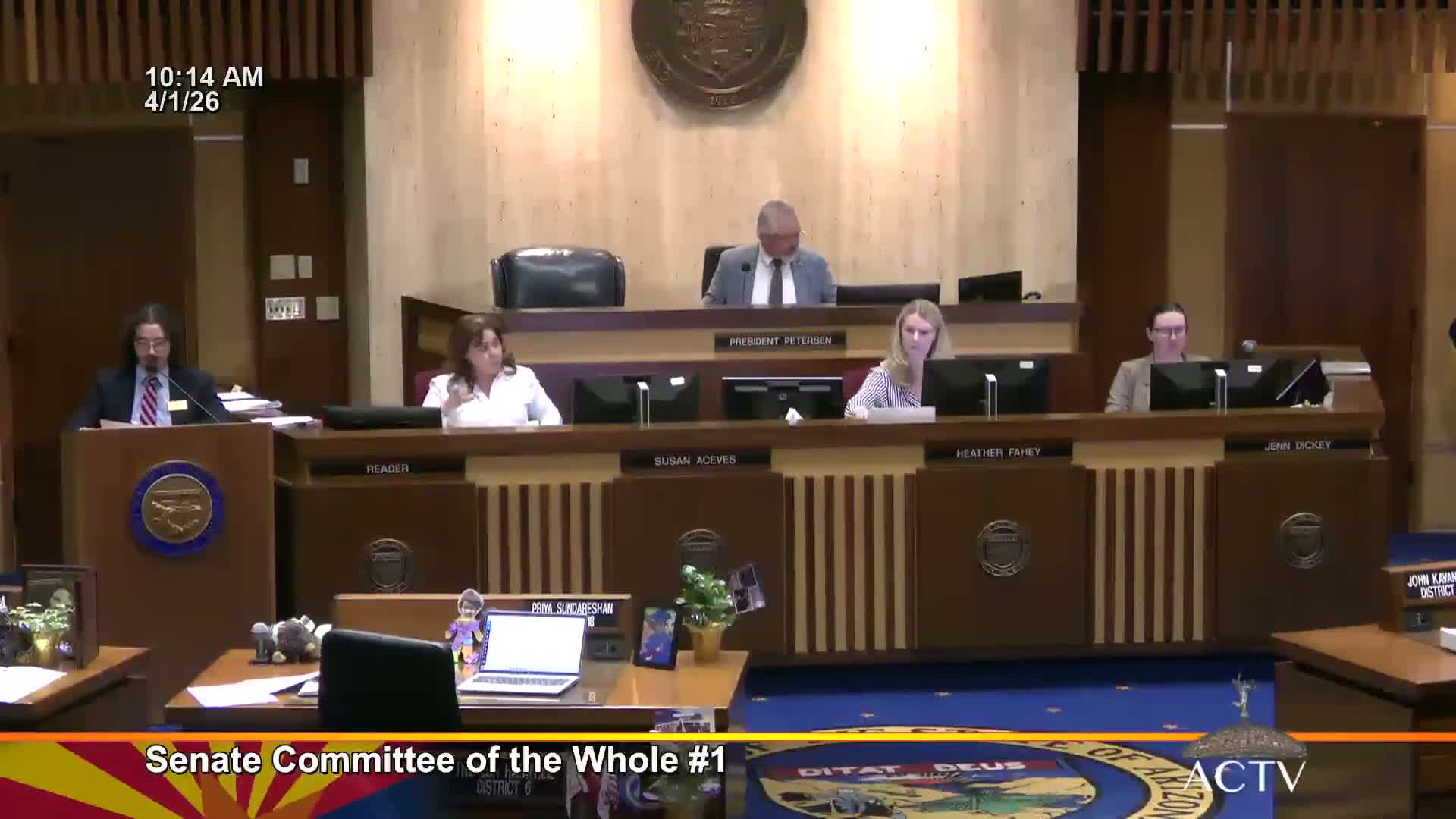 The Arizona State Senate on April 1, 2026, convened and approved a package of House bills after Committee of the Whole consideration, adopting committee amendments where offered and recording floor votes on multiple measures.