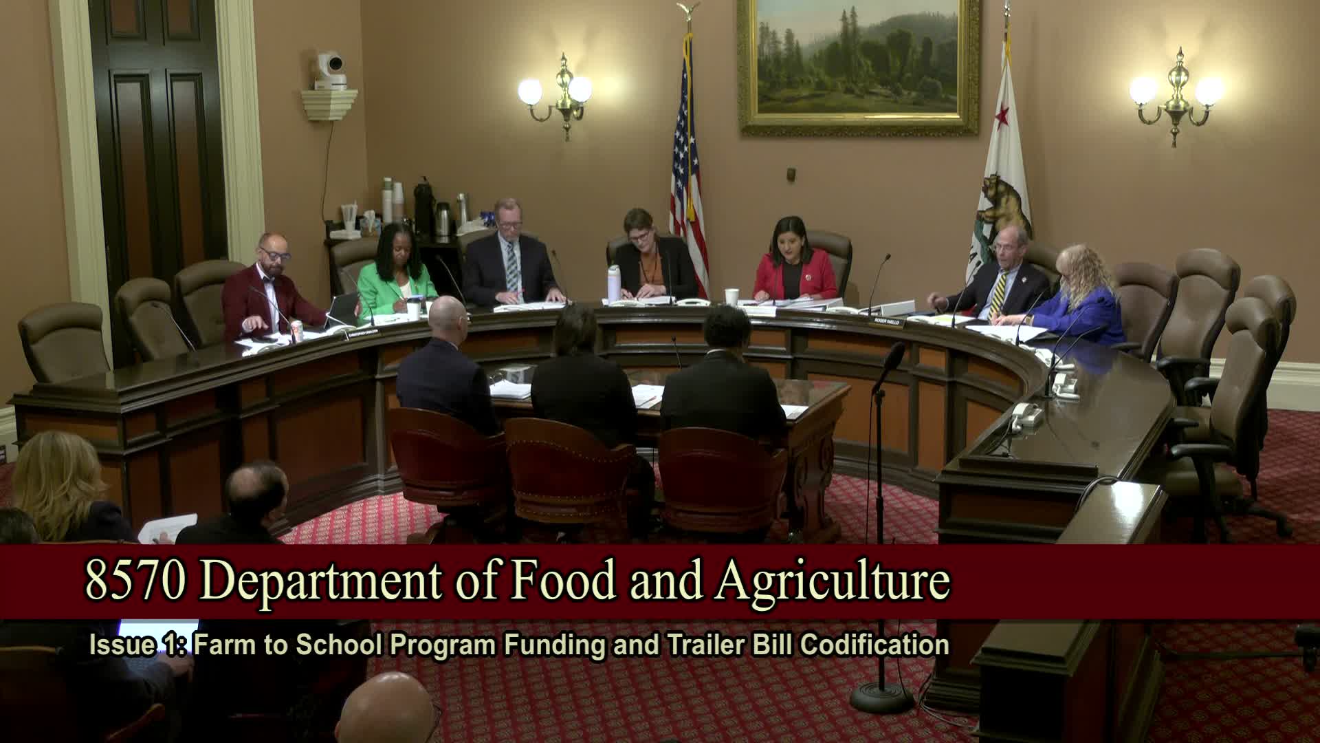 The Department of Food and Agriculture asked the Senate subcommittee to make its Farm to School incubator grant program permanent with $20 million in ongoing grants and funding for evaluation and outreach; the Legislative Analyst’s Office urged caution given the state’s budget limits and suggested alternatives such as Prop 98 counting.