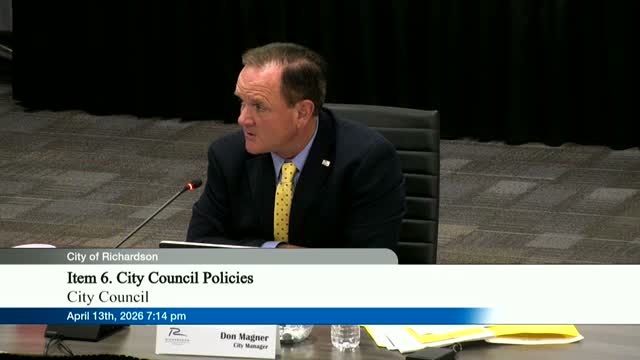 City communications staff and the city secretary presented a package of proposed policies on flag displays, days of recognition, ceremonial recognition types and an optional 'key to the city' honor. Greg Sol, the city’s director of communications, told council the International Wall of Flags was created to reflect Richardson’s designation as an international-business center and staff recommend eligibility tied to significant, ongoing operations (e.g., headquarters, R&D, advanced manufacturing) rather than retail or mailing addresses.
