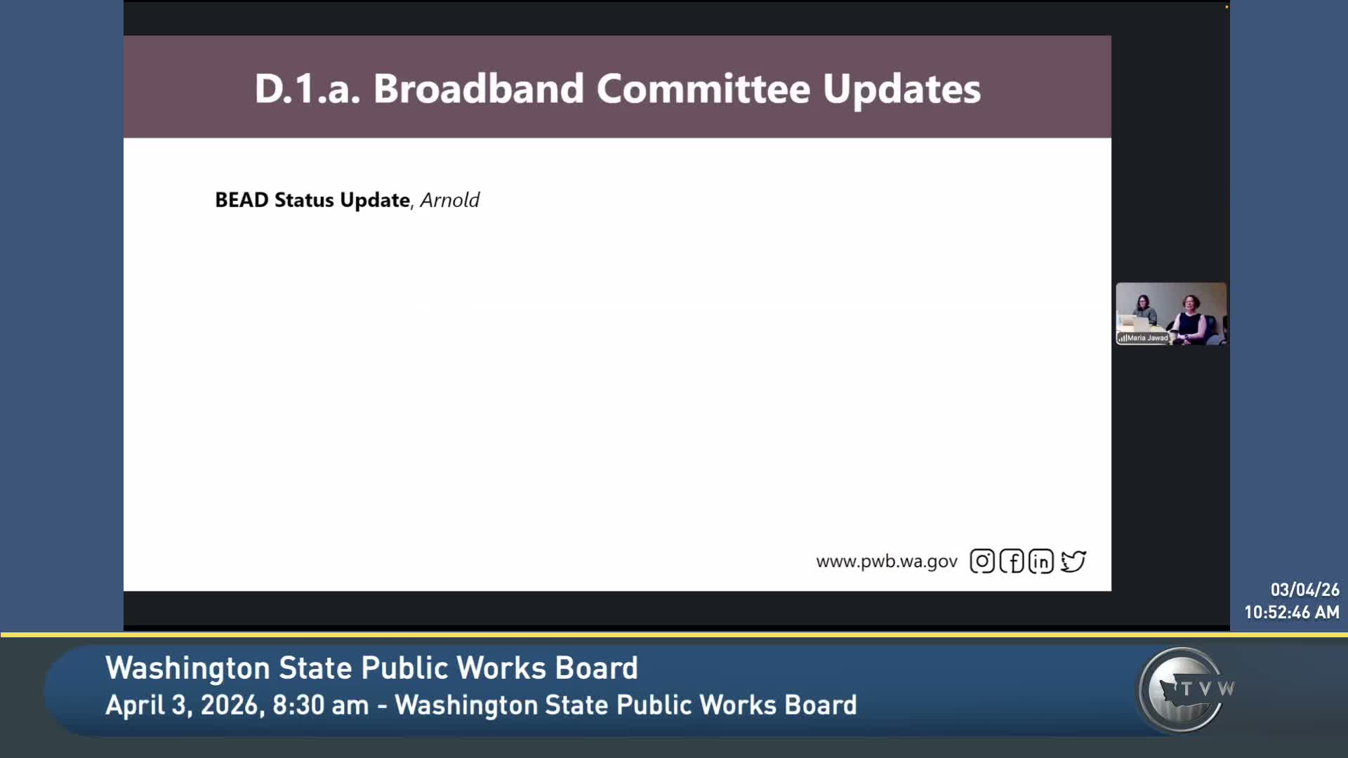 Jordan Arnold, Washington’s new state broadband director, briefed the Public Works Board on the BEAD (Broadband Equity, Access, and Deployment) program and the state’s approach to using federal and state match funding.