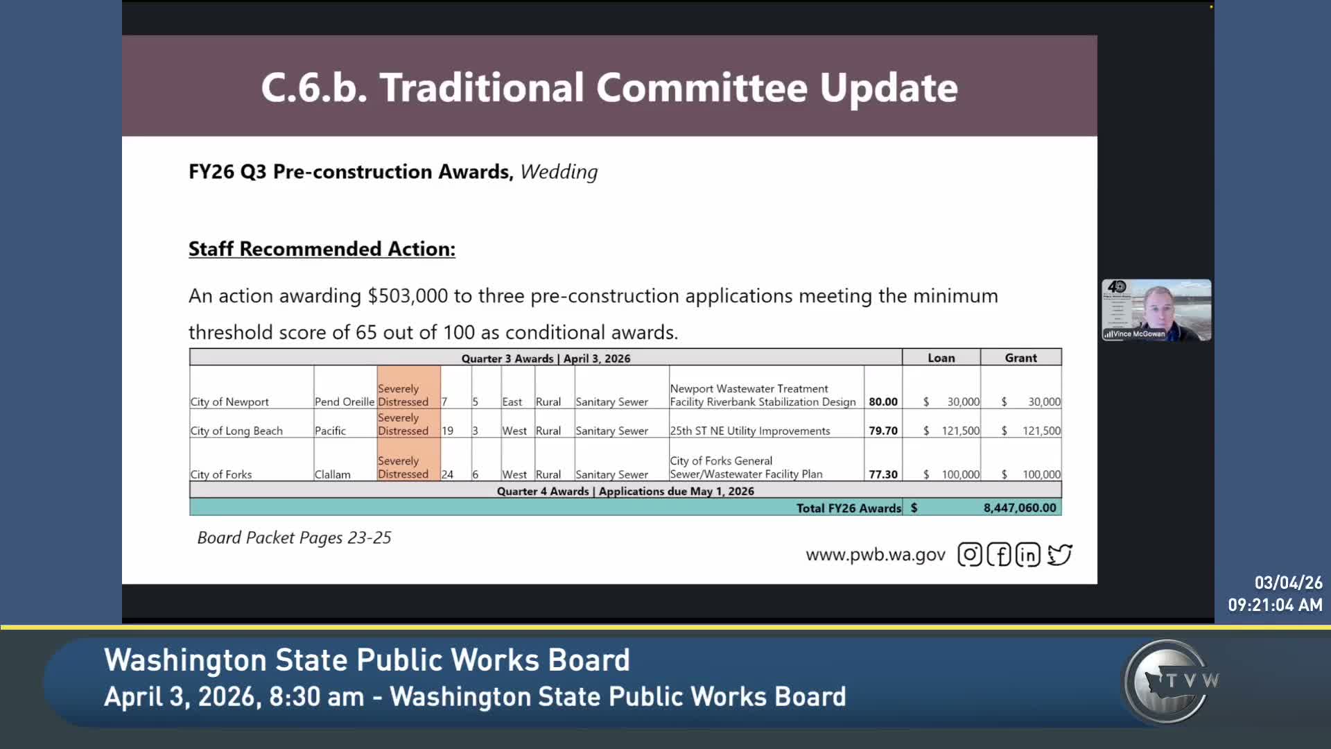 At its April 3 meeting the Public Works Board approved staff recommendations to reallocate FY26 emergency funds and to award emergency repair funds to two jurisdictions.