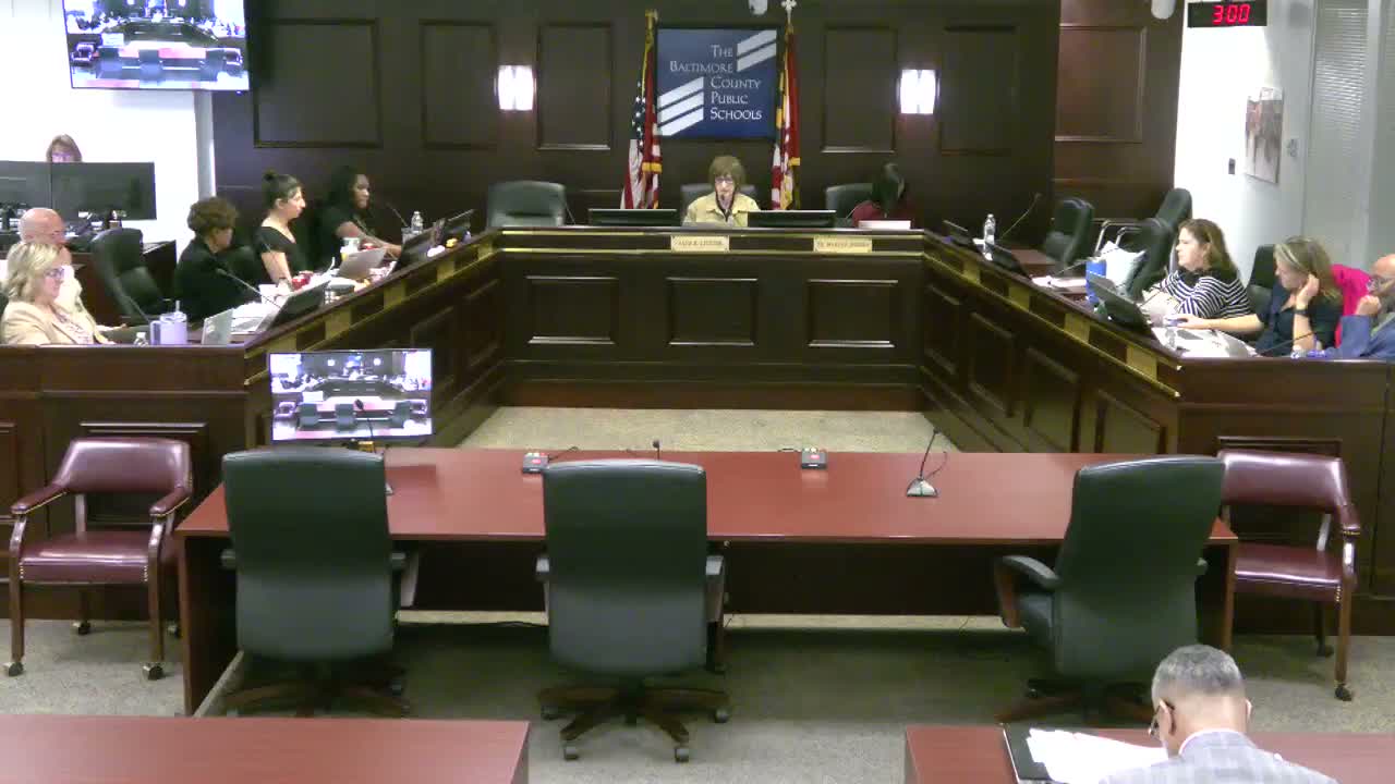 The Baltimore County Board of Education voted to adopt the boundary committee's recommendation (Option B) for the Southeast Area elementary schools after a failed amendment seeking to expand and reconstitute the committee. Board members debated Title I/community school funding portability, special education placements, and planning-block data before the 7–2 vote.