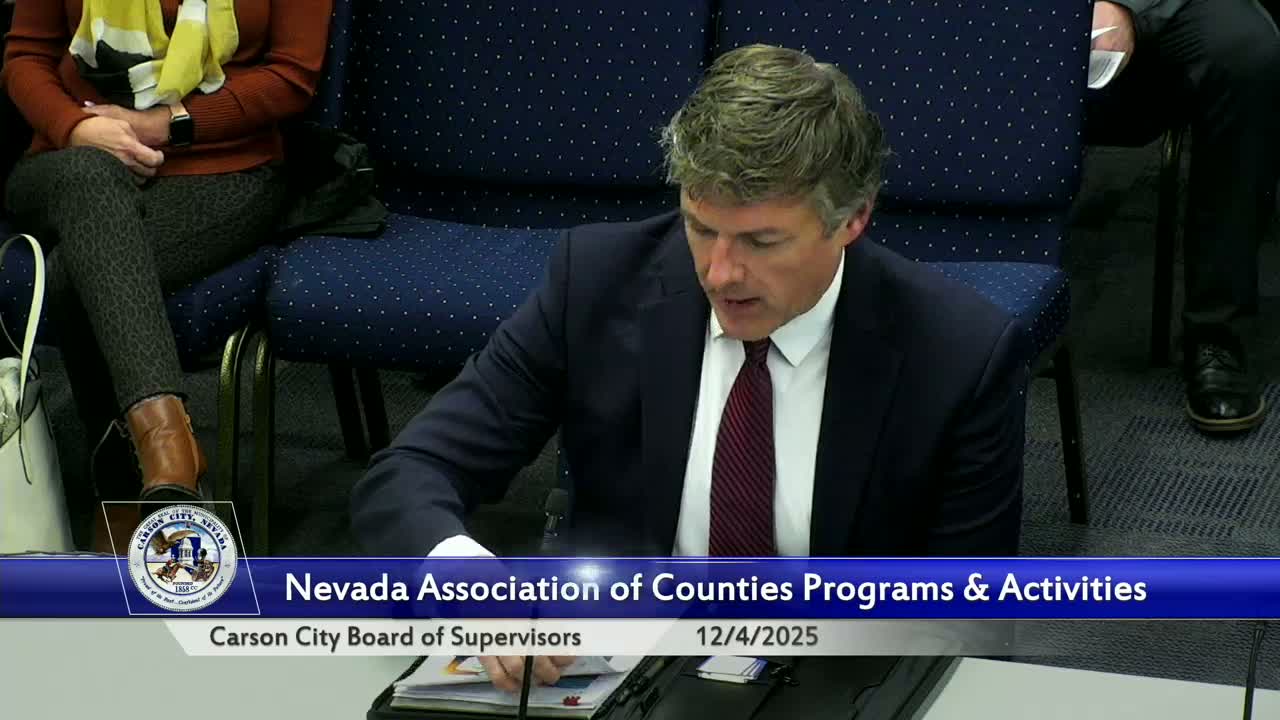 The board received an informational presentation from the Nevada Association of Counties (NACO) on its statewide and national roles, recent organizational changes, and key legislative work. Vincent Guthrie, NACO executive director, said NACO achieved 100% membership among Nevada counties and described recent governance updates and committee work, including a revived emeritus committee and new subcommittees focused on cooperative extension and housing.