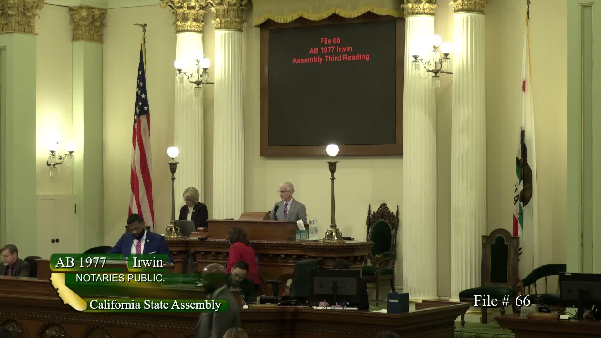 The Assembly passed AB 1977 on April 14, a measure to clarify and correct ambiguities in the Online Notarization Act ahead of broader implementation. Assemblymember Erwin presented the bill, which the sponsor described as necessary to ensure online notarization operates "in practice" by 2030 and to strengthen consumer protections for users and notary platforms.
