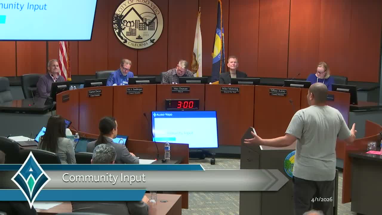 During public comment Aliso Viejo residents warned about potential safety issues and cost for a proposed pump track (estimated by commenters at $850,000–$1 million), urged more park lighting and protected bike lanes, while the Boys & Girls Club endorsed the pump track as a youth amenity.