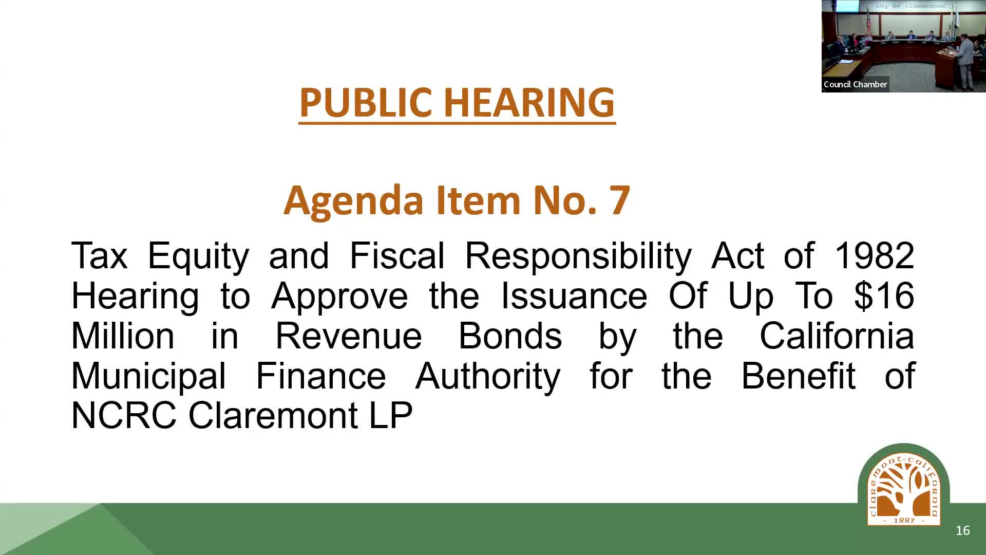 The Claremont City Council adopted a resolution at a TEFRA hearing to allow the California Municipal Finance Authority to issue exempt facility bonds not to exceed $16,000,000 for development of a 59‑unit senior affordable housing project at 830 West Bonita Ave.