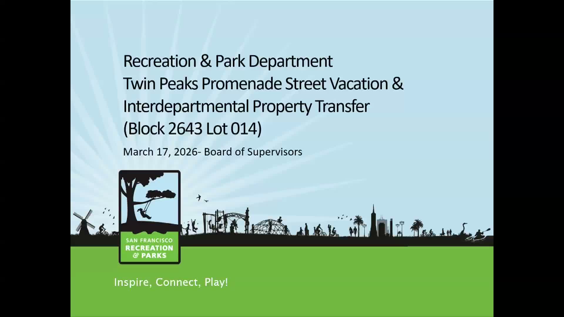 The Board of Supervisors heard a Rec and Park presentation on the Twin Peaks Promenade and approved a required street vacation and interdepartmental transfer on first reading, clearing the way for construction to begin in 2026 with previously approved grant funding.