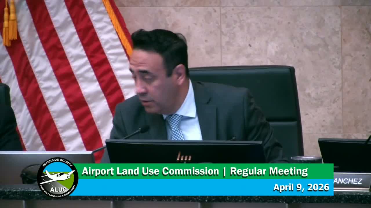 Commissioners heard an extended briefing April 9 on a draft amendment to the March Air Reserve Base/Inland Port Airport Land Use Compatibility Plan, which staff said incorporates changes in the Air Installation Compatible Use System (ACUS) including a second runway, associated accident‑potential zones (APZs) and updated intensity and hazard language.