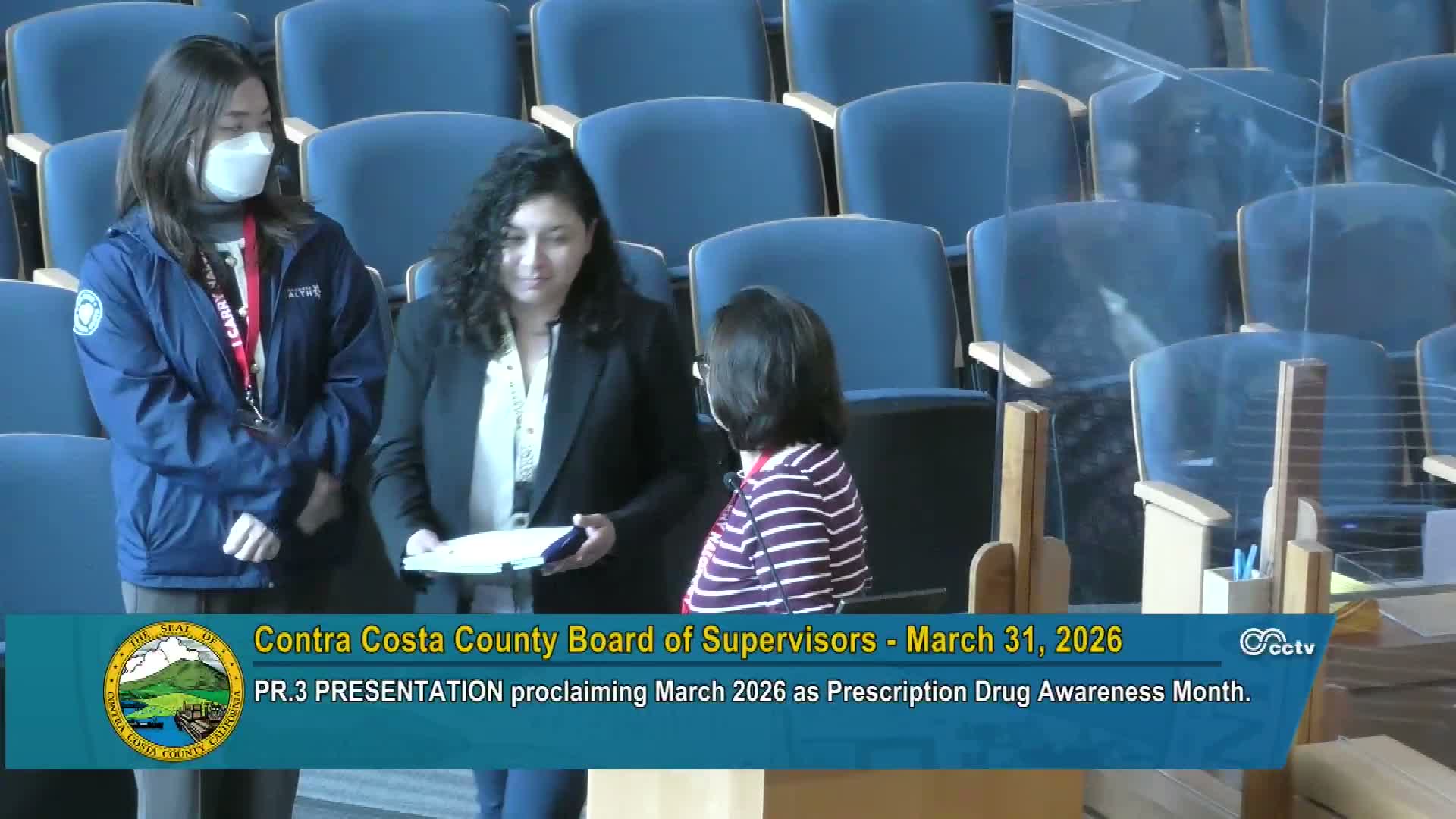 Contra Costa County proclaimed March 2026 as Prescription Drug Misuse Awareness Month at the Board of Supervisors meeting on March 31 and heard presentations from behavioral‑health staff and coalition partners about local prevention work.