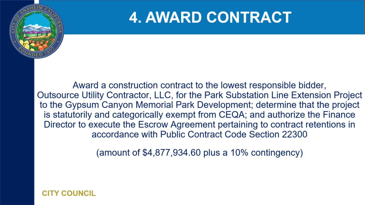 Council approved awarding a construction contract (approx. $4,880,000 plus contingency) to Outsource Utility Contractor LLC to install underground electrical infrastructure and street lighting along Sand Canyon Road to support Gibson Canyon Memorial Park; Anaheim Public Utilities staff said costs will be reimbursed by the project applicant and construction is expected to run 2026–2027.