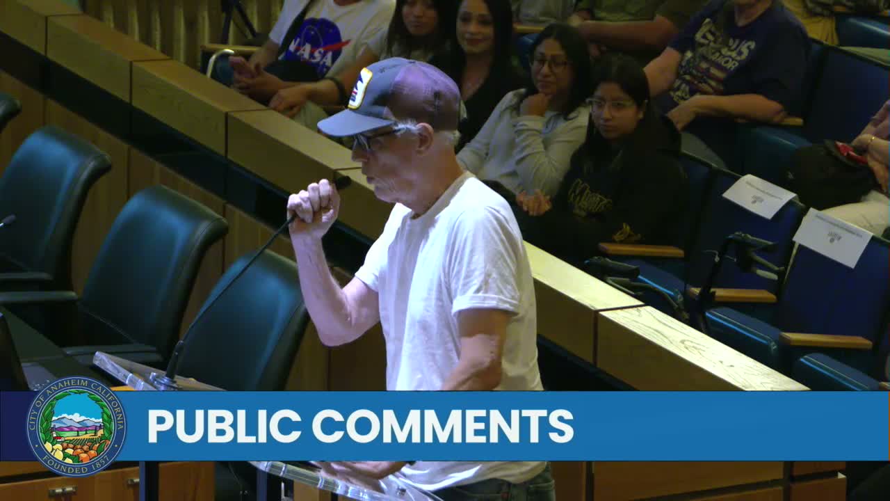 Multiple residents urged the City Council to investigate whether nightly Disneyland fireworks contribute to perchlorate and heavy‑metal contamination in Anaheim's groundwater and settled dust; speakers asked for a cross‑agency study involving EPA, AQMD and state water boards and cited Well 39's perchlorate detection.
