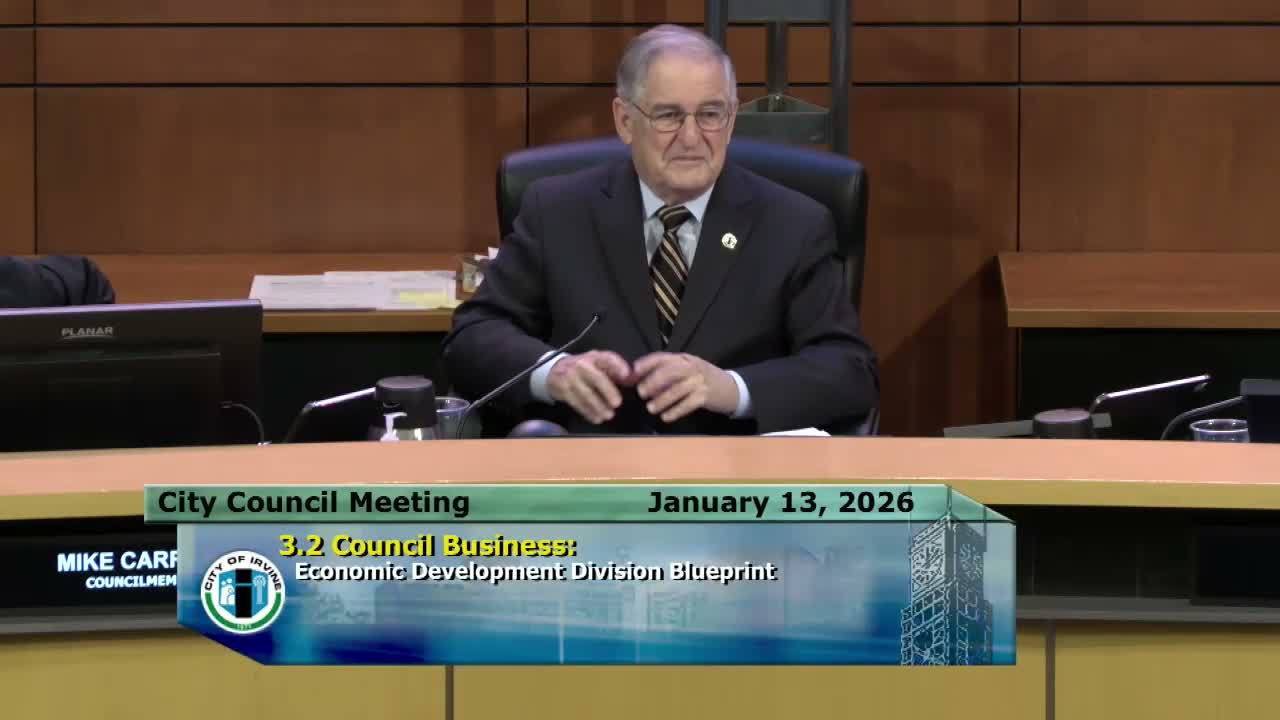 The Irvine City Council voted 7-0 to adopt a two-year economic development blueprint and authorize staff to pursue creation of an Irvine Center of Innovation and Entrepreneurship, including MOUs, an RFP for an accelerator operator and fundraising, with staff to return with business plans and site recommendations.