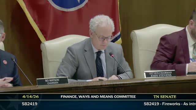 Sen. Stevens told the Senate Finance Committee April 14 that SB 2419 creates a new subcategory for low‑risk 'novelty' and sparkling fireworks (party poppers, ground fountains and similar items) that will not require full fireworks permitting but must be sold by retailers registered with the State Fire Marshal; committee recommended the bill for the calendar.