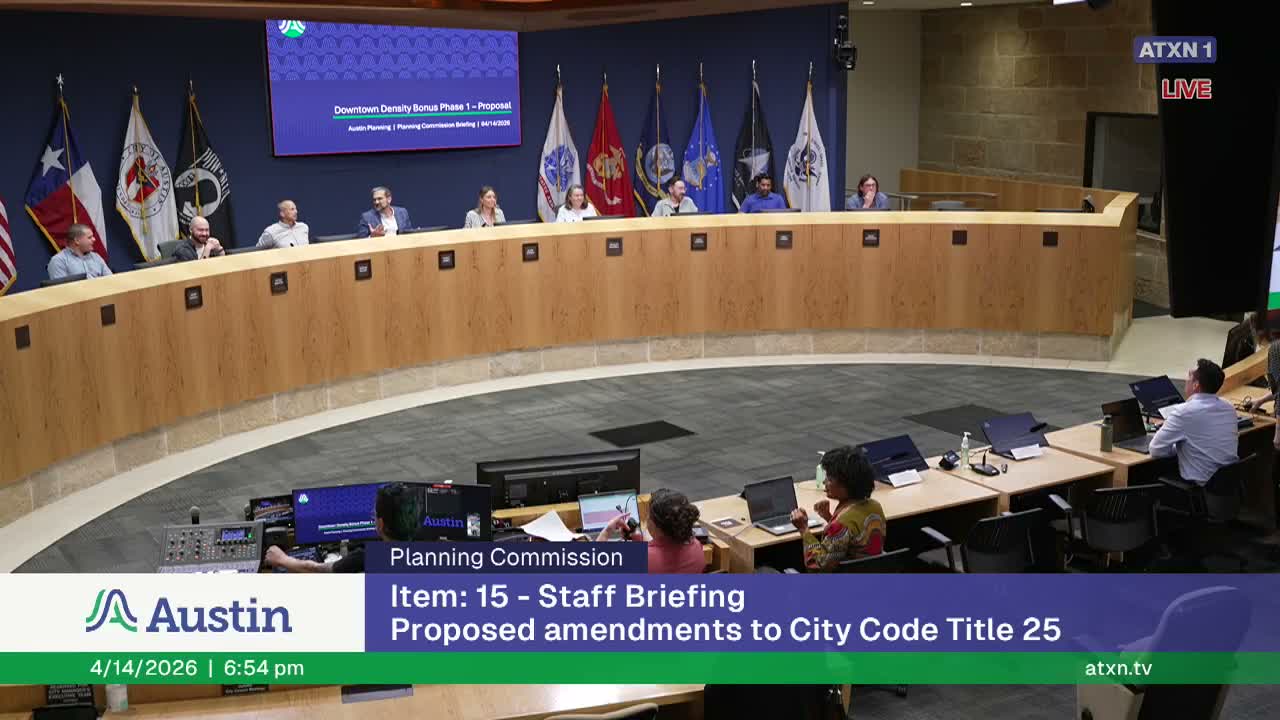 Planning staff presented proposed Phase 1 changes to Austin’s downtown density-bonus program, including a move from FAR (floor-area ratio) complexity to fixed height combining districts, new urban design standards, and a clearer affordability requirement.