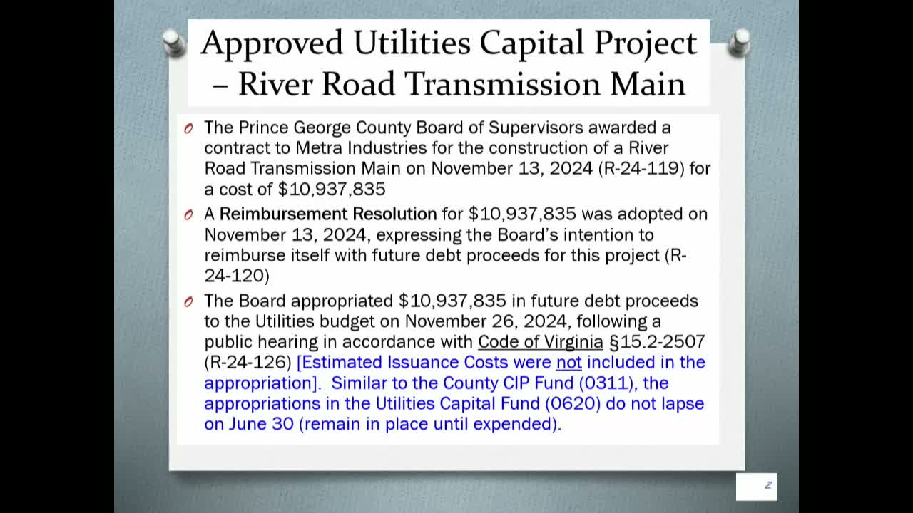County staff told the Board that construction is underway for a transmission main and a 1,000,000-gallon ground storage tank with a 3,000,000-gallon-per-day booster station on River Road, and that engineers estimate the transmission-main project at roughly $10.9 million. At the November 2024 meeting the Board authorized the contract award and a reimbursement resolution; staff now seek consensus to issue debt to reimburse utility cash reserves used during construction.