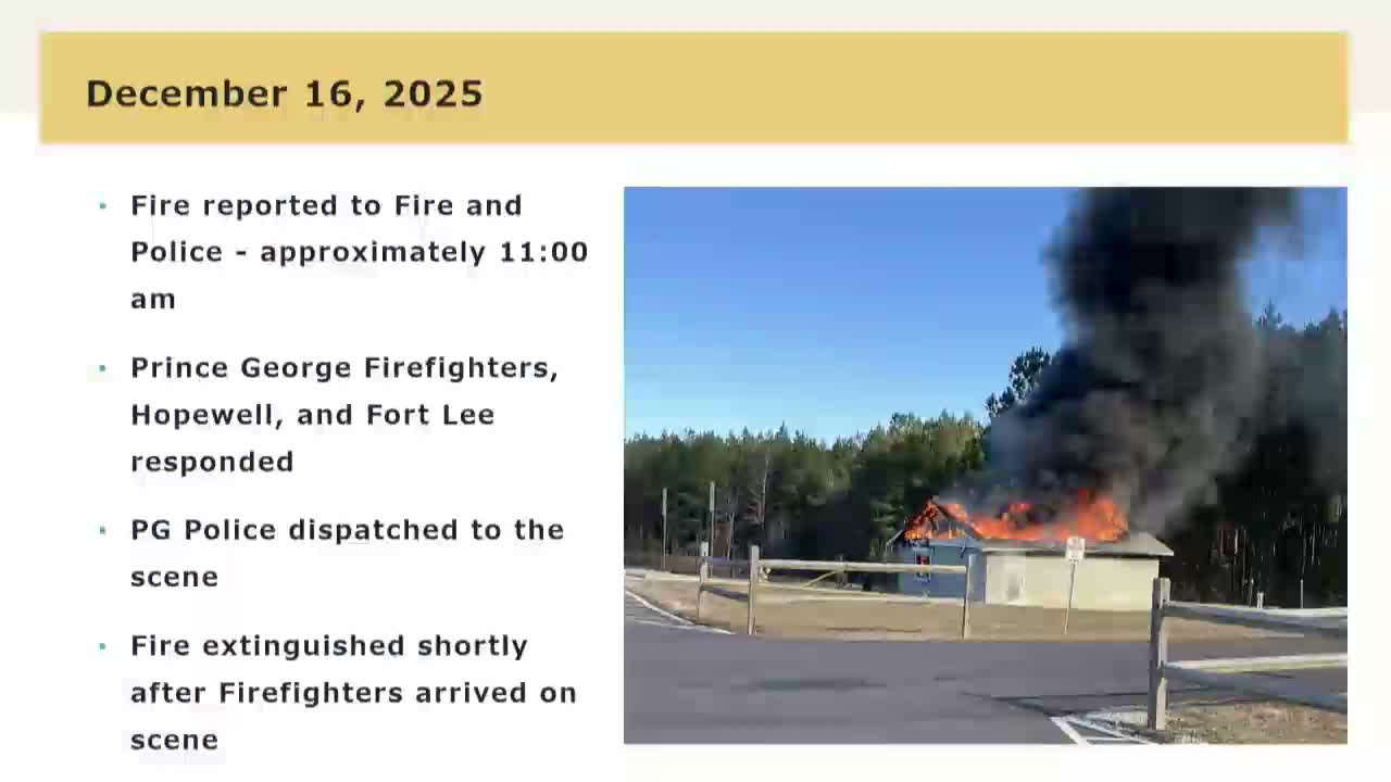 General Services presented a timeline and damage assessment for the December 16 fire at the Upper Scott Park concession stand and reported preliminary findings from a structural engineer indicating CMU walls and the existing slab are suitable for reuse.