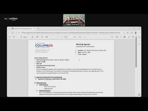 The Columbus Art Commission voted to enter an executive session on April 15, 2026, citing Ohio law to consult with its attorneys about a pending court action. Chair read the statutory motion on the record, naming three individuals invited to attend the closed meeting.