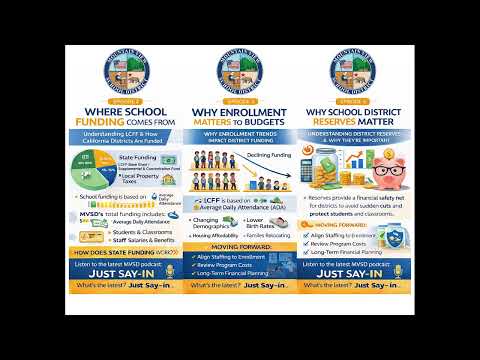 On the Just Sayin' podcast, Mountain View School District fiscal director Lisa Loop said California's Local Control Funding Formula (LCFF) is the district's primary revenue source, supplying more than 95% of unrestricted funds and about 70% of total funding; she described supplemental funding streams for high-need students and listed restricted grants that support programs and facilities.