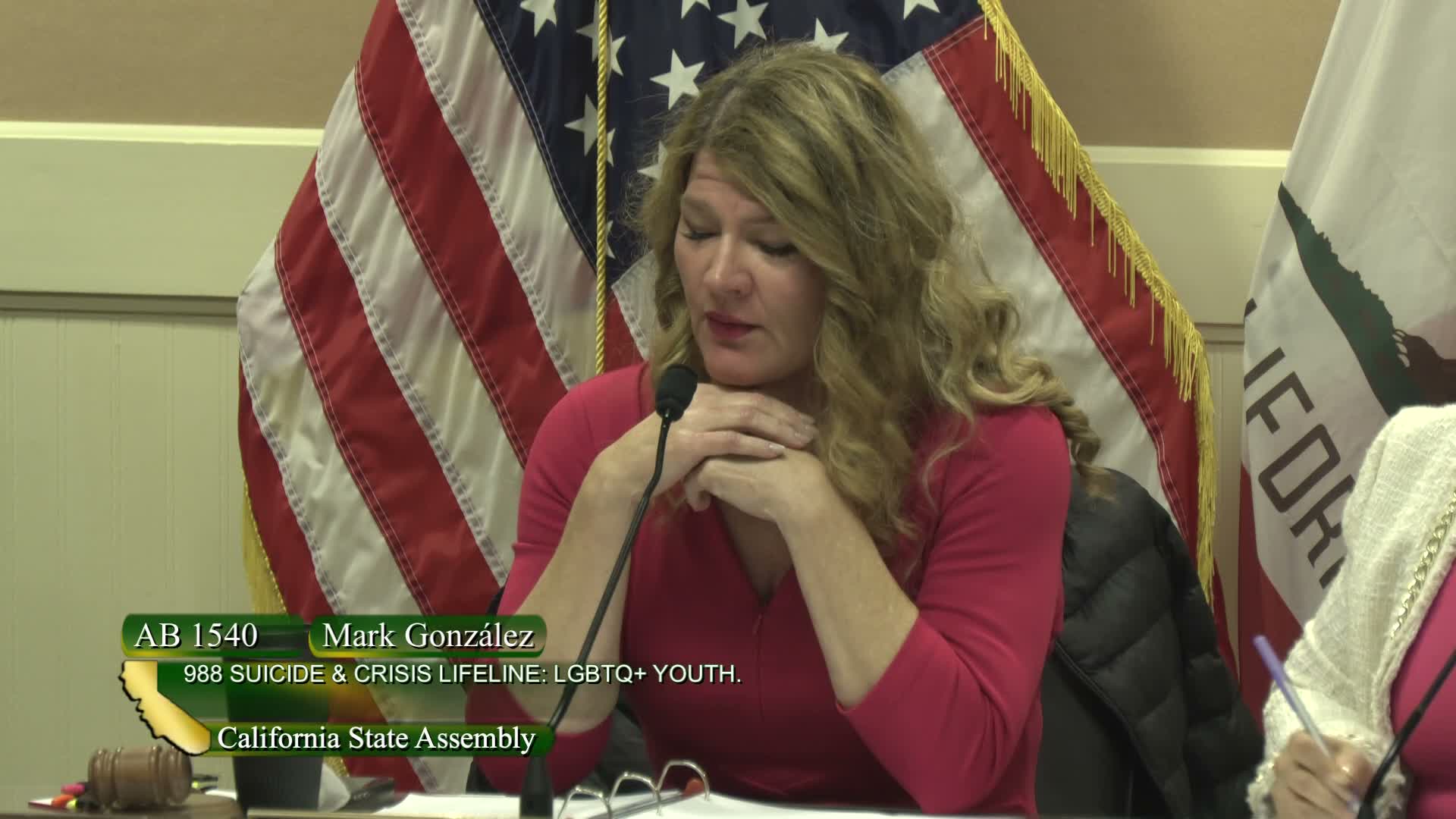 - AB 15 40 (Mark Gonzales) — 988 routing for LGBTQ+ youth: Do pass; referred to Appropriations. Committee recorded the bill as out; chair left roll open for additional members (transcript records 'out' and a 7-0 tally on record).