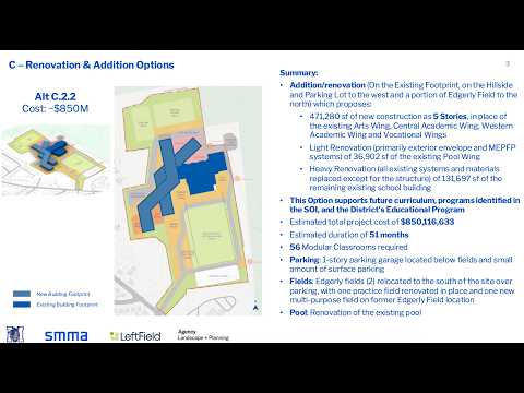 The presentation matters because the layout choices affect daily student movement, construction phasing and temporary classroom needs. A committee member said community members, including their own children, are worried about how students will live and learn through the construction and about the number of modular classrooms shown in the option.
