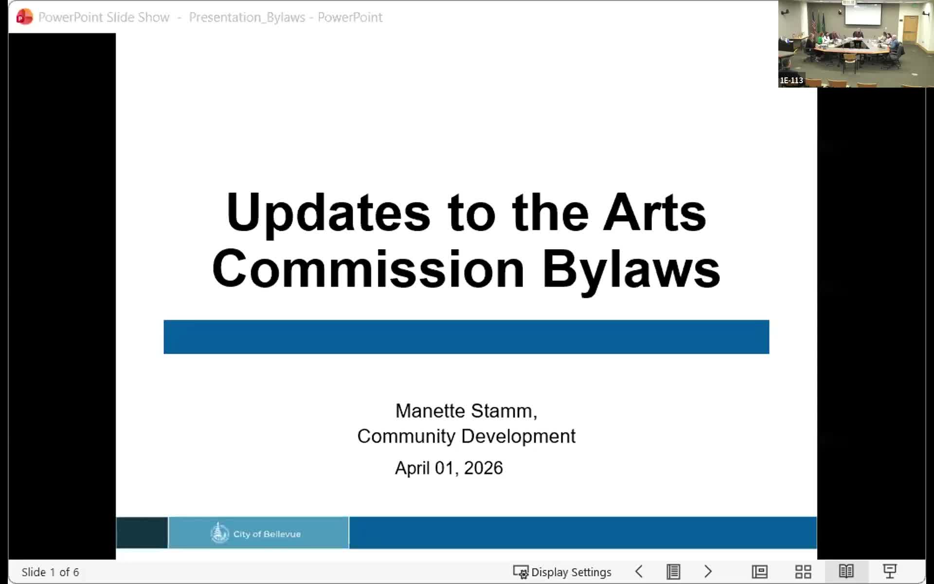 Staff outlined recommended bylaw edits (term-limit clarifications, increasing decorum exclusion from 60 to 180 days, neutral pronouns) and briefed the Commission on upcoming grant cycles, Bel-Red planning, the Grand Connection art plan, feasibility studies for an outdoor event facility and performing-arts center, and the temporary removal/storage of the Bellgate artwork.